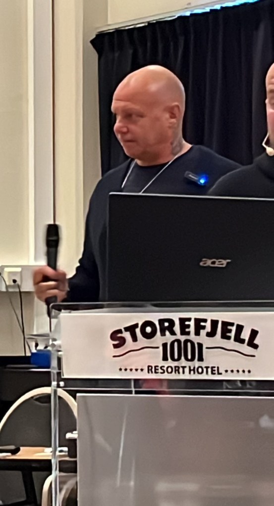 Da var det visstnok pause og tid for utsjekking, som jeg allerede hadde gjort. Så jeg stålsatte meg for neste foredragsholder. Dette blir sterkt, virkelig. Dan Gøran Espedal skal fortelle om sitt liv som minerydder og likhusspesialist og påfølgende PTSD diagnose. Ikke rart i det hele tatt. Jeg trengte luft, noen dype magedrag, litt frukt, krydderkake og påfyll av kaffe og vann. Og det gjør jeg jammen nå også, ta en pause altså, og litt kaffe, for kake har jeg ikke. Fortsettelse følger … Av denne magiske dagen …