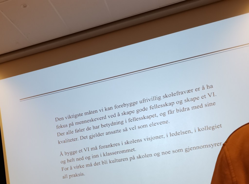 Hun fortsetter med å henvise til Formålsparagrafen – Overordnet del ( https://www.udir.no/lk20/overordnet-del/ ), dette som SKAL være førende, men som skjelden gjøres. Det handler om menneskeverd, likeverd, verdier, menneskemøter, å bli sett (så fint vi er her på denne konferansen og ser hverandre. Men de som skulle vært her er ikke her). Alle sammen i virksomheten. Jeg tilføyer i verden. Jeg oppfordrer, selv om Sara Eline og jeg selv har erfart at det hjelper så lite å si ifra til de voksne, at de ikke hører eller vil høre om urett og utenforskap. Si ifra likevel. Noen vil høre til slutt.