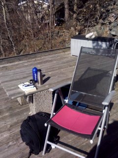 Ja, jeg valgte en uprøvd sti i dag, en som viste seg å være enklere å gå også. I tillegg fant jeg en platting med bord og stoler vel framme ved sjøkanten. Selv om det ante meg at alt dette tilhørte en hytte i nærheten, satte jeg meg ned. Det sto jo ikke noe: Forbudt- for- uvedkommende- skilt noe sted, så da var det vel fritt fram på den fine plassen, godt i lè for vinden.