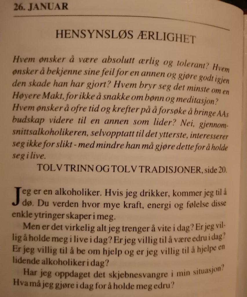 På daglig basis starter jeg dagen med å lese fra Daglige Refleksjoner, med bønn og meditasjon. Nettopp for å lage meg en god start på dagen og for å repetere hvorfor jeg trenger å gjøre dette. Jeg er et avhengighetsmenneske, og er avhengig av å gjøre dette for at jeg skal finne sinnsro, en bestanddel i det å kunne være nykter. Deretter deler jeg om mine erfaringer, en ærlig beretning om mitt liv som nykter alkoholiker, om mine opp -og nedturer, om selve livet nå kontra før – hva skjedde…